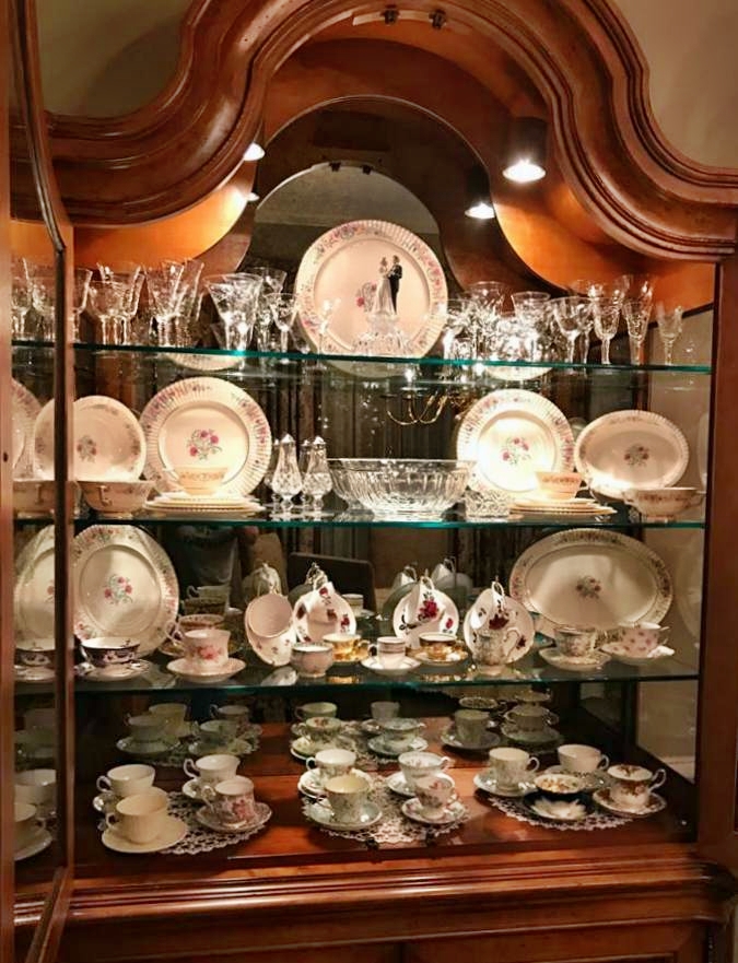 I love china and teacups. Momma never had china until later in life and I have no memories associated with it. She did have 4 Red Rose Tea promotional teacups stashed above the fridge in an amazingly greasy cabinet (Momma fried stuff and the vent on the wall was by that cabinet, also Dad had a fully functional machine shop in the basement for his hobby jobs).